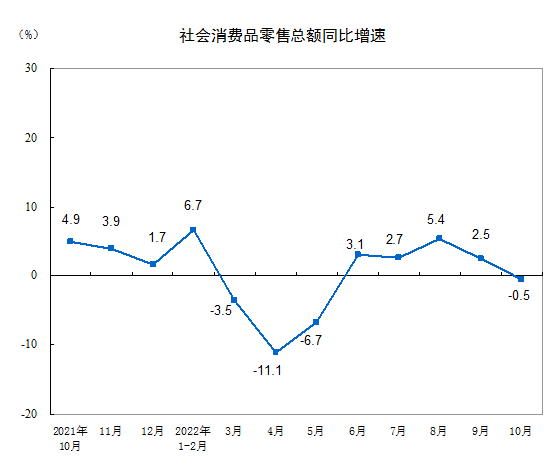 10月份,社会消费品零售总额40271亿元,同比下降0.5%。其中,除汽车以外的消费品零售额36575亿元,下降0.9%。