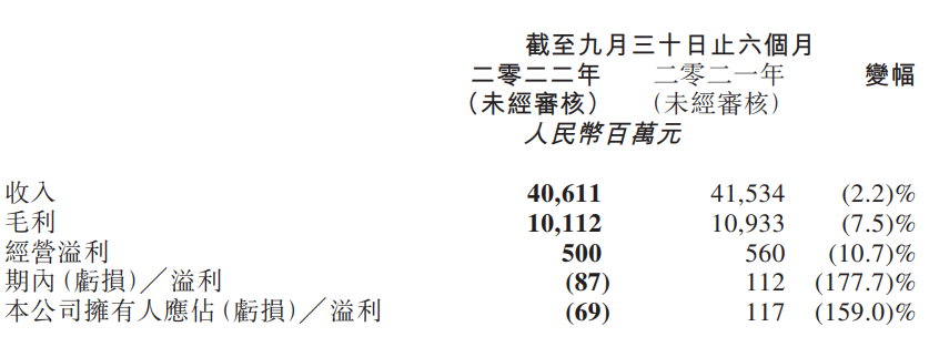 龙商网消息:11月15日,高鑫零售发布2023财年中期业绩(2022年4月1日-2022年9月30日)。报告期内,高鑫零售实现营收406.11亿元,同比下滑2.22%;归属上市公司股东的应占净利-0.69亿元,同比下滑158.97%;同店销售同比下降0.2%;来自销售货品的收入为390.84亿元,同比下降1.70%;租金收入15.27亿元,同比下降13.87%;毛利为101.12亿元,同比下降7.51%;毛利率为24.9%,同比减少1.4个百分点。