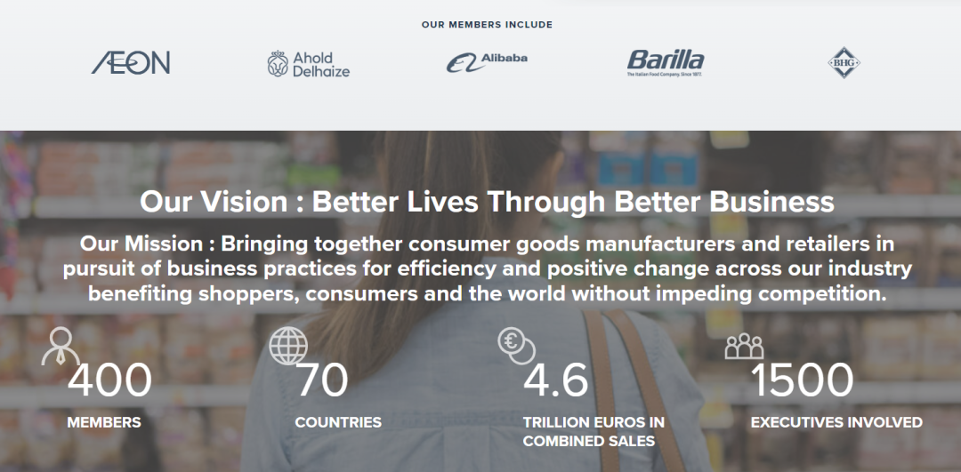 CGF汇聚了来自70多个国家的400多家成员,总销售额达4.6万亿欧元,是全球规模最大、影响力最广、最具行业价值的会员制组织,覆盖了零售商、生产商、服务提供商以及其他利益相关方,被誉为“零售业的达沃斯”。其管理机构董事会包括56位全球知名生产商和零售商的CEO,如阿里巴巴集团CEO张勇、蒙牛集团CEO卢敏放等。