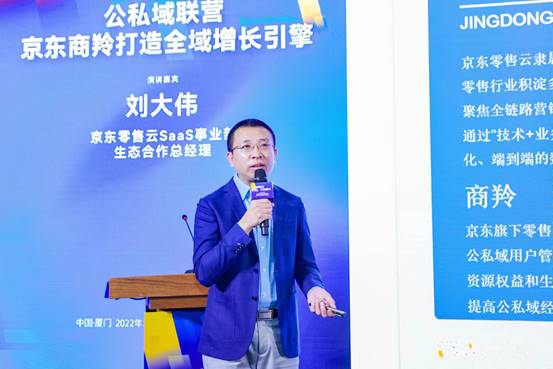 京东零售云受邀出席大会,向行业受众展现了门店全链路数字化解决方案,京东零售云SaaS事业部生态合作负责人刘大伟还在现场作主题演讲,向业界展示京东零售云公私域联营解决方案--京东商羚多端商城。
