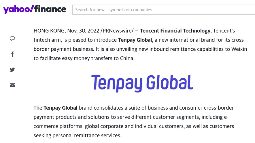 龙商网消息:12月6日,腾讯子公司腾讯金融科技近日推出其跨境支付业务的全新国际品牌财付通全球(Tenpay Global)。它还向微信推出了新的汇款功能,以方便向中国汇款。