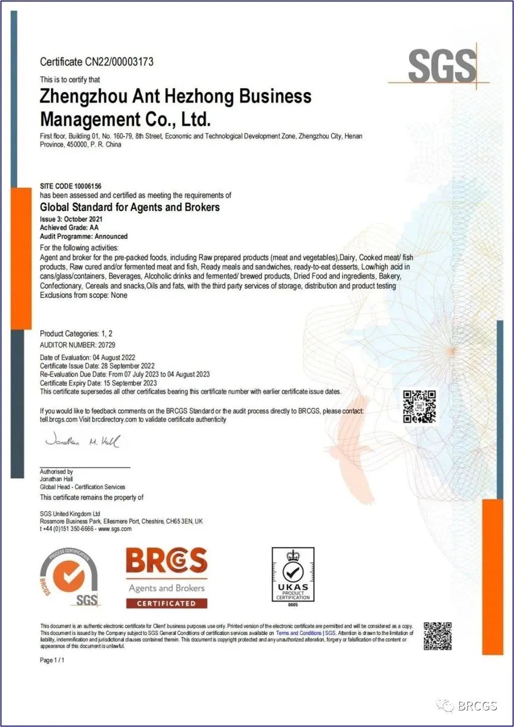 很高兴也很荣幸,蚂蚁商联通过SGS的认证审核,顺利取得BRCGS A&B(代理商与经销商)认证证书!在此,也非常感谢BRCGS机构对蚂蚁商联的认可!