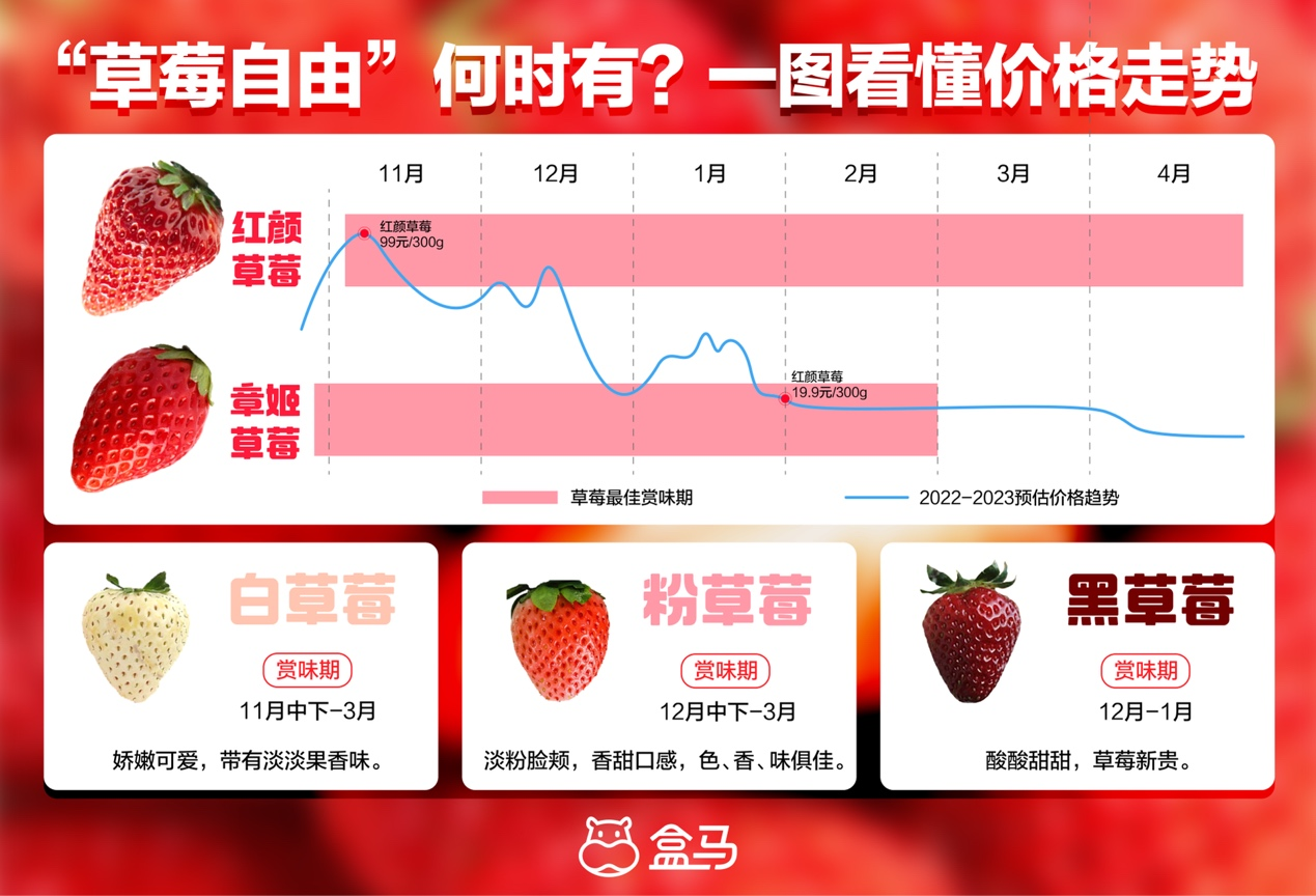 据了解,目前盒马在卖的草莓主要是章姬草莓和红颜草莓,占据水果销售榜第一。部分城市也已上架白草莓。12月底,粉草莓也即将面世,草莓品种的丰富度将达到高峰。