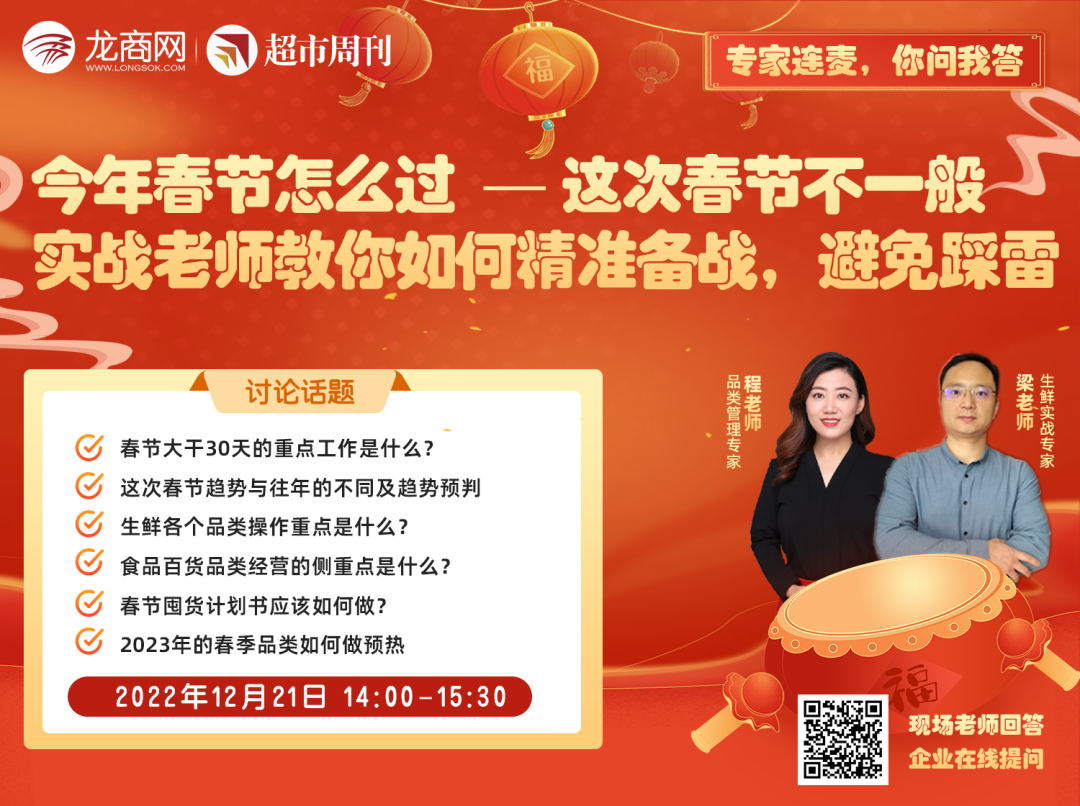 今年的春节怎么过 12月21日14:00 龙商网超市周刊直播 今年春节与以往有什么不同 消费者更关心什么样的商品 今年的春节礼盒怎样备货 春节销售计划求如何制定 春节销售的品类重点在哪里 如何预热2023年春季品类经营 特邀实战老师和品类专家为你解答 欢迎扫码预...