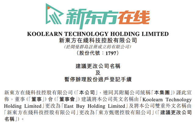 1月5日,新东方在线科技控股有限公司(简称“新东方在线”,01797.HK)公告,董事会建议将公司英文名称由“Koolearn Technology Holding Limited”更改为“East Buy Holding Limited”及将公司双重外文名称由“新东方在线科技控股有限公司”更改为“东方甄选控股有限公司”。