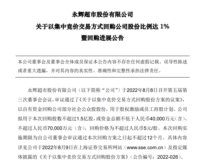 龙商网2月2日消息: 永辉超市于2022年8月8日召开第五届第三次董事会会议,审议通过了《关于以集中竞价交易方式回购股份方案的议案》,以自有资金回购公司部分社会公众股股份,用于股权激励或员工持股计划。公司拟用于本次回购股数不超过1.5亿股,或资金总额...