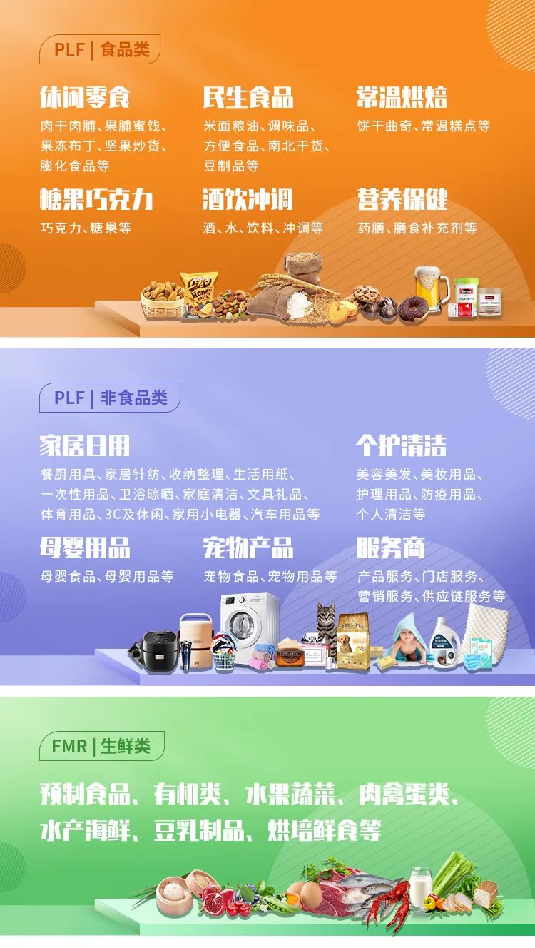 业务范围包括家居日用、美妆个护、休闲零食、粮油副食、杂粮干货、调味品(料)、烘焙糕点、糖果巧克力、酒饮冲调、生鲜食材、预制食(菜)品、宠物产品、营养保健、母婴用品等;