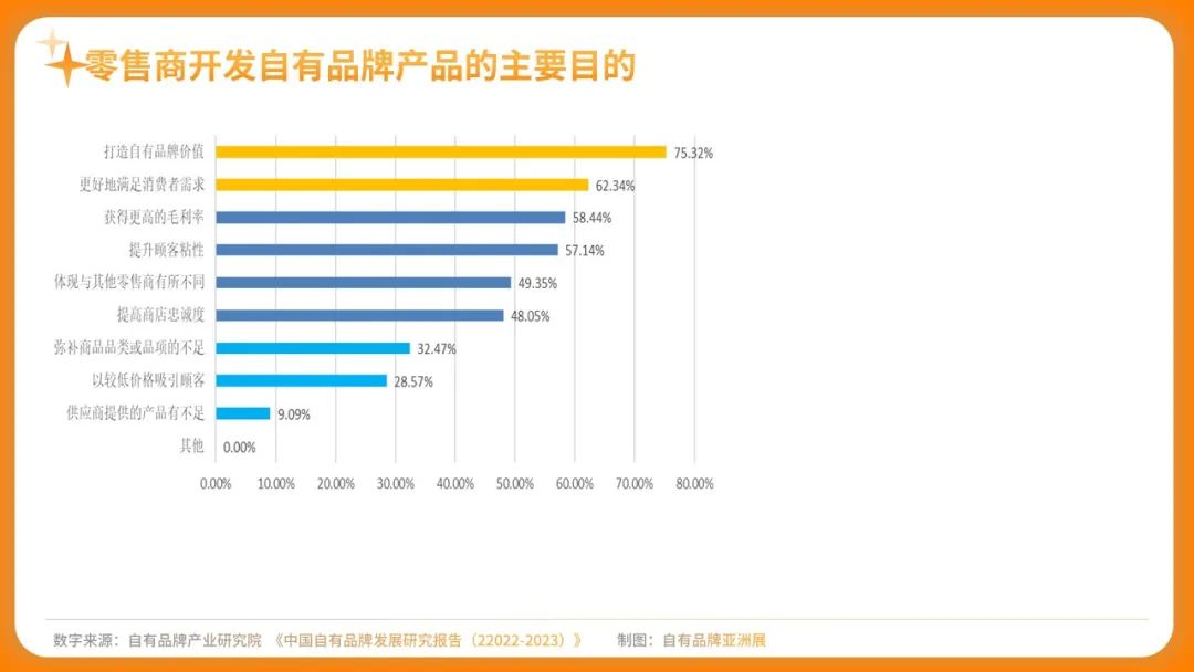 根据《中国自有品牌发展研究报告(2022-2023)》最新数据表明,近年来自有品牌贡献度不断攀升,仓储式会员店、新零售、线上零售、便利店等业态为代表的零售商成为自有品牌开发的主力军,产品升级、品牌升级是自有品牌团队工作的重点之一。