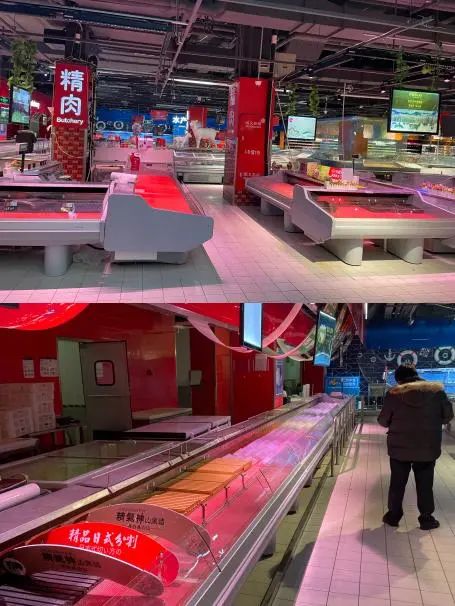1月31日,记者探访北京家乐福凯德MALL大峡谷店、双井店、健翔桥店、定慧桥店、方圆店发现,门店的主食厨房、熟食、肉类、海鲜、低温冷藏等区域均已没有商品供应,也无工作人员值守。而很多区域看似放满,实际上是同一种商品摆在货架上填满了整面,部分门店的冰柜、蔬菜、水果等区域放置了大量商品纸盒,但纸盒内却并没有商品。