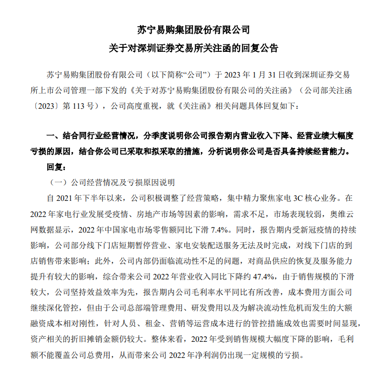 苏宁易购因业绩大幅度亏损等获深交所关注函
