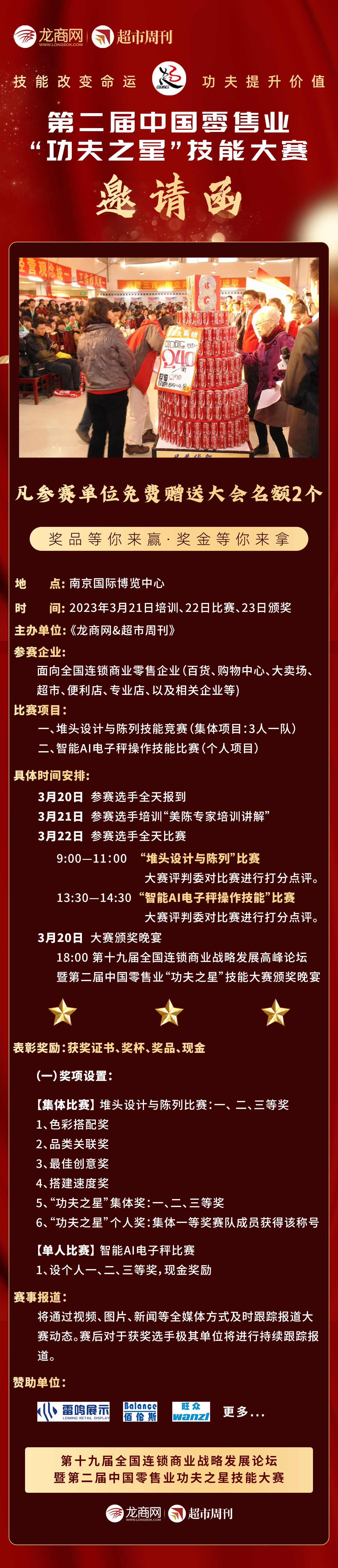 为响应和配合第二届全国技能大赛,促进零售行业提升员工技能,龙商网&超市周刊充分发挥自身行业资源优势,定于3月21-23日,在南京举办第二届中国零售业“功夫之星”技能大赛。