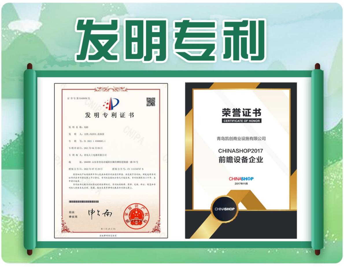 青岛凯创冷链所首创的亚洲风系列冷冻柜,已于2019年11月在中国连锁经营协会青岛博览会Chinashop成功上市,并获得了业内人士的极大关注和高度称赞。目前该系列产品已于2021年申请并获得了国家发明专利,专利号为“ZL20211 0380083.1”。