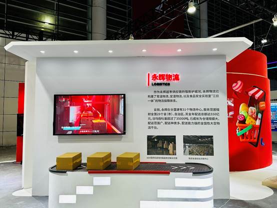 在到家业务的互动展区,永辉超市搭建了小型“虚拟仓”,用户可以在该展台扫码、下单,通过仓内的履约数字屏,更切实地感受到数字化带给零售行业的升级迭代。