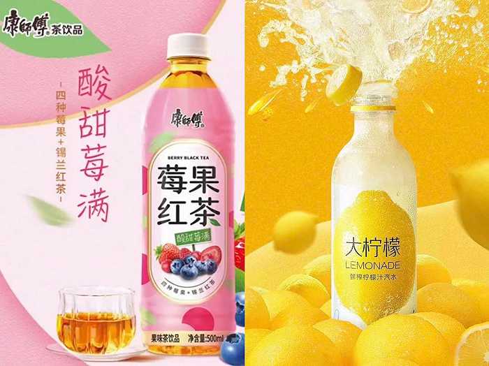 康师傅莓果红茶和农夫山泉出品的大柠檬