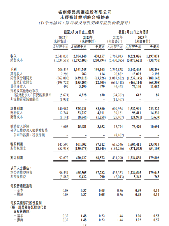 龙商网消息:5月16日,名创优品发布截至2023年3月31日止第三季度的未经审计财务业绩,该集团期内收入为29.54亿元,同比增长26.2%,环比增长18.4%;毛利为11.62亿元,同比增长64.4%,环比增长16.5%;毛利率为39.3%,2022年同期为30.2%,前一季度为40.0%;经调整净利润为4.83亿元,同比增长336.3%,环比增长29.5%;股东应占溢利4.66亿元,同比增加382.12%;每股基本盈利0.37元。公告称,收入同比增加主要是由于来自中国的收入同比增长18.1%及来自海外市场的收入同比增长54.6%。此外,期内名创优品门店数量截至2023年3月31日为5514家,同比增长401家,环比增长74家。TOPTOY门店数量截至2023年3月31日为116家,同比增长24家,截至2022年12月31日为117家。名创优品首席财务官兼副总裁张靖京表示,本季度公司毛利率达到39.3%,比2022年同期高出900个基点,这得益于我们对品牌升级工作的坚定执行,以及海外市场的强劲表现。
