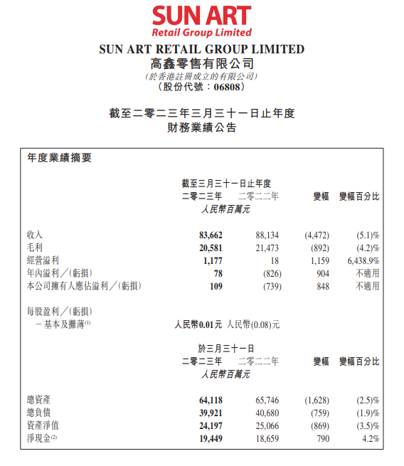 龙商网消息:5月16日,高鑫零售发布截至2023年3月31日的2023财年业绩报告。财报数据显示,高鑫零售2023财年收入836.62亿元,同比减少5.1%;营业利润达11.77亿;净利润7800万,实现扭亏为盈;拥有人应占溢利为1.09亿元,较去年同期的亏损7.39亿元增加8.48亿元;毛利为205.81亿元,同比减幅为4.2%;毛利率为24.6%,同比增加0.2个百分点。报告期内,高鑫零售开出了582家门店,已覆盖全国29个省市自治区的212个城市。在本财年,B2C业务可持续增长并成为高鑫的核心竞争力,营收增长超过15%。自有APP“大润发优鲜”的营收较上财年同期增长约40%。高鑫的淘鲜达业务持续稳步增长,是淘宝近场生鲜品类的核心供给;饿了么渠道客单价增长,带动营收较上财年同期增长近20%。