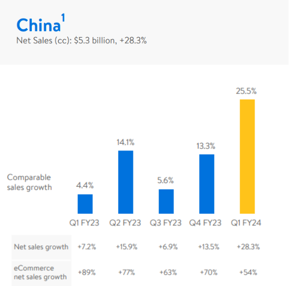 值得注意的是,沃尔玛中国区第一财季净销售额373.39亿元(53亿美元),同比增长28.3%,可比销售额增长25.5%,电商业务净销售额增长54%。