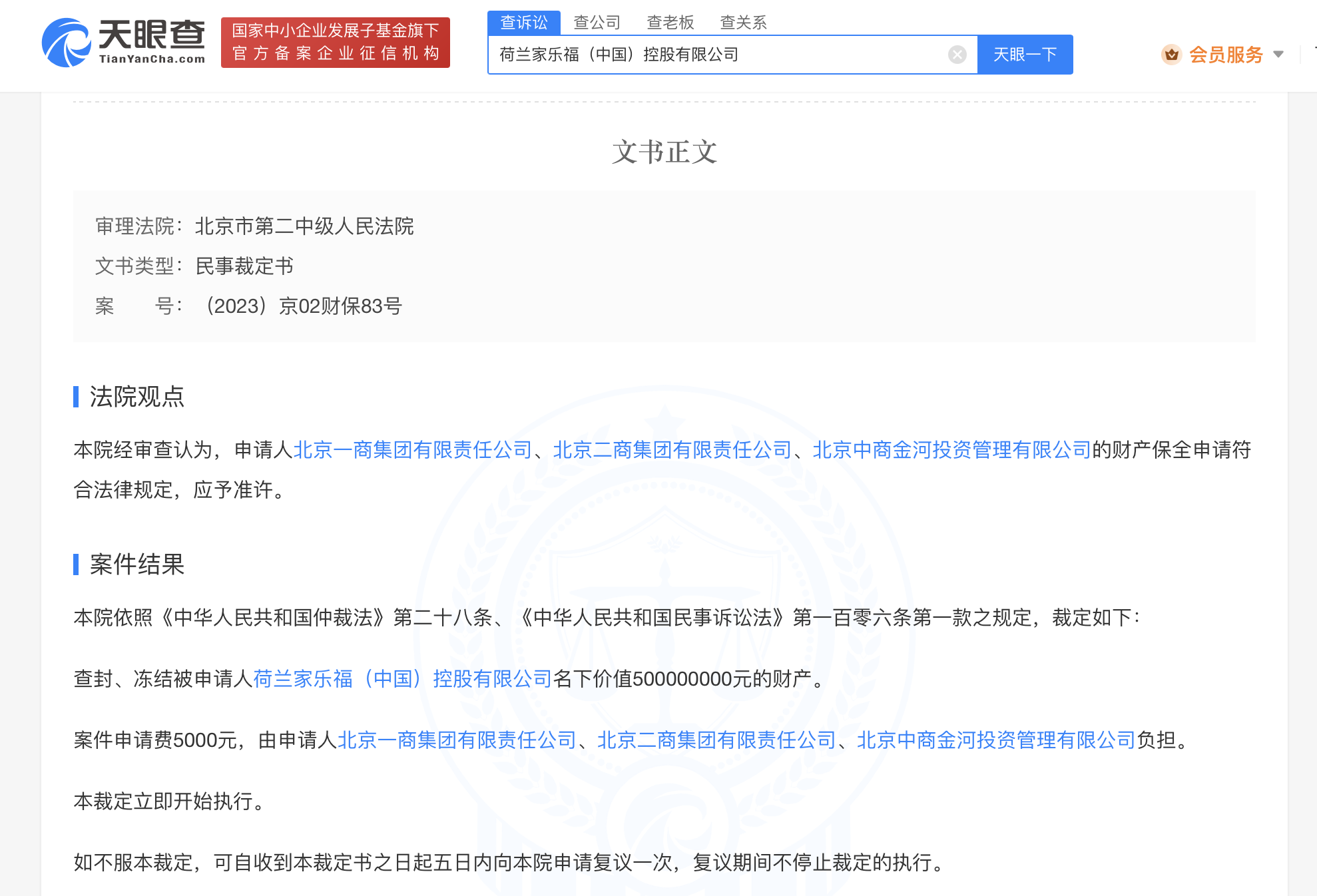 据北京市第二中级人民法院6月2日发布的民事裁定书显示,申请人北京一商集团有限责任公司、北京二商集团有限责任公司、北京中商金河投资管理有限公司向中国国际经济贸易仲裁委员会申请仲裁程序中的财产保全,请求查封、冻结被申请人荷兰家乐福(中国)控股有限公司名下价值5亿元的财产。