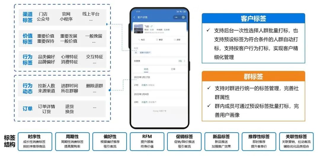 在与顾客的互动环节中,企微助手与会员标签全面融合。顾客喜好、消费特性、潜在价值等都可以在企微助手中形成对应的画像,方便一线员工进一步拓展“熟客经济”,通过顾客画像或筛选标签的方式针对性的推送营销活动,有效提升营销转化率、服务效率与顾客粘性等。