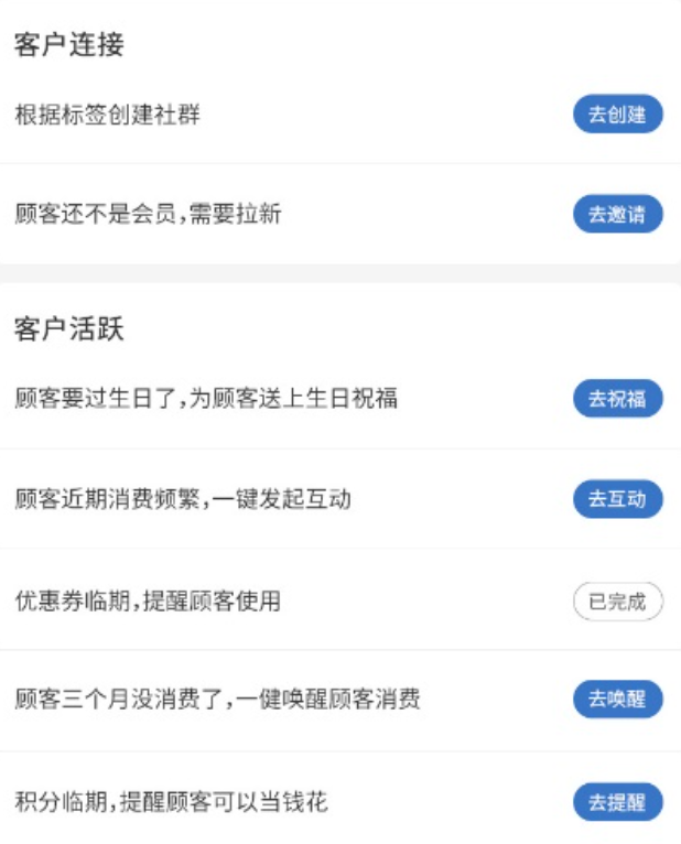 针对新入职或者刚接触企微助手的一线员工,可以在工作台内的新手任务模块中“打怪升级”,快速掌握如何通过企微助手开展私域运营工作,如:标签拉群、发起投票活动、完成每日任务、发起生日祝福等。