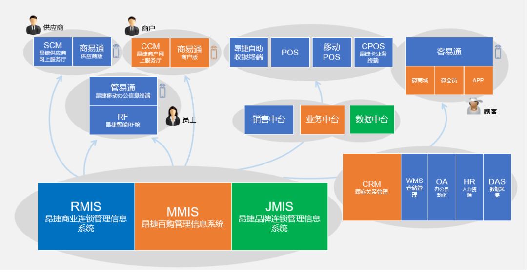 * 昂捷商业连锁管理信息系统:服务于商超、便利、专营店(母婴连锁、日用小百货、文具连锁)、百货(自营商品部分)业态。