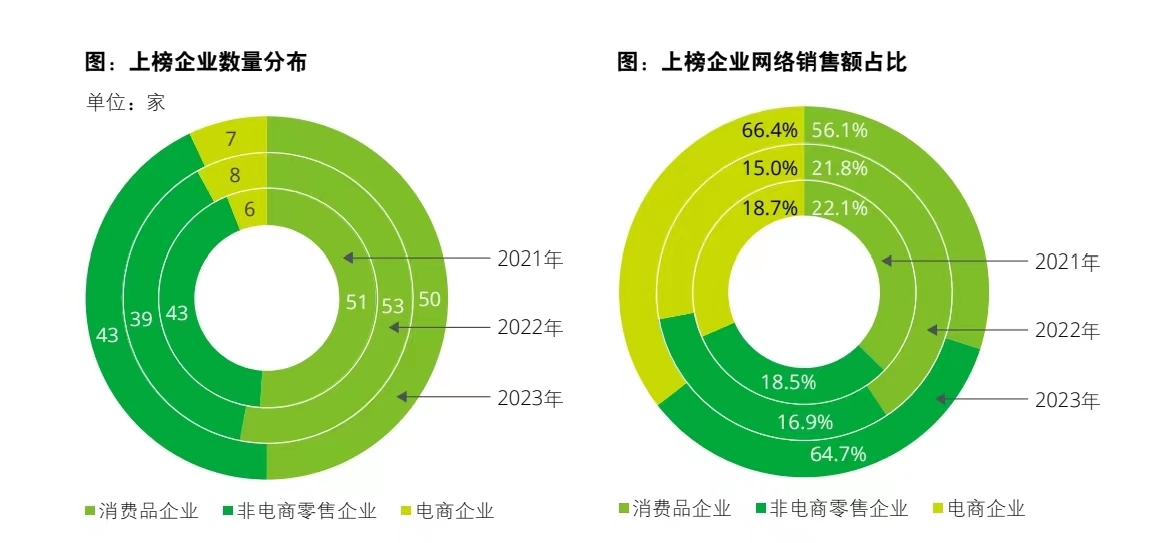 2023年TOP100上榜企业中,7家是电商企业,非电商企业达到93家。2021年至2023年,非电商企业数量和网络销售比重整体呈上升趋势。其中,消费品企业网络销售规模逐年增加。