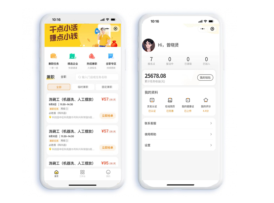 在零工用户端,为了让更多一线蓝领员工们快速上手,小活儿的整体界面非常简洁,完成了实名认证和签订自由职业者服务协议后,即可快速查看附近的工作任务并抢单。当然,自由职业者也可以在平台上通过完善简历、上传健康证等步骤去接一些个性化的特定工作任务单。