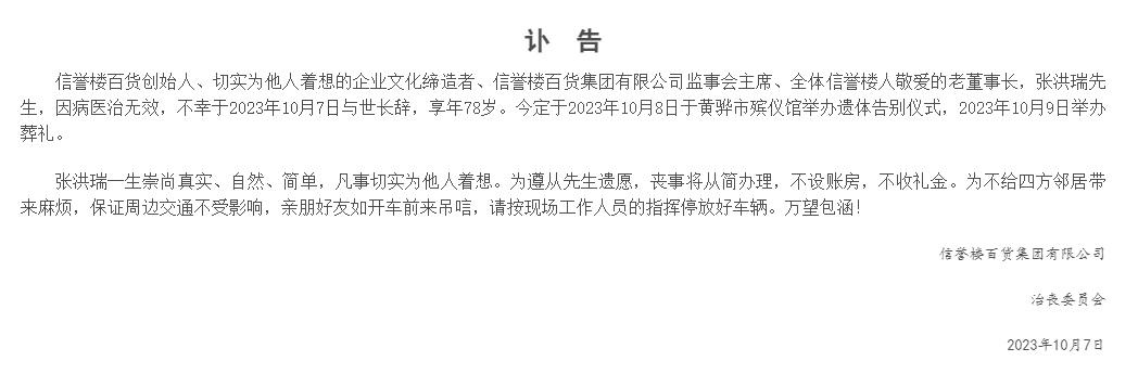 龙商网消息:10月7日,信誉楼创始人、老董事长张洪瑞因病医治无效逝世,享年78岁。