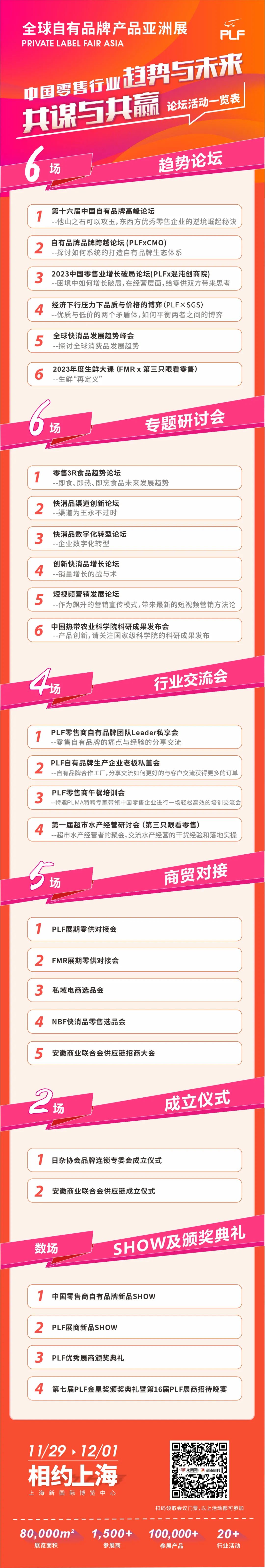 除了观展,本届展会的论坛活动也比往届更加有看点。论坛、研讨、交流、展示、陈列、对接……活动形式不断创新,论坛议题紧跟趋势。PLF2023上海展将带来5场趋势论坛、7场专题研讨会、4场零供对接会、3场行业交流会,还有专为展商、零售企业搭建的品牌宣讲平台——数场PLF新品SHOW。