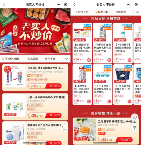 龙商网了解到,大润发“老实人不炒价”延续了此前“不吵价”的质价比理念,鲜奶、酸奶、常温高端奶,洋酒、奶酪等作为让利主打,约千款商品将持续低价。从29.9元1箱的认养一头牛纯牛奶,到179元1瓶的芝华士 12年苏格兰威士忌,更有像简爱酸奶滑滑、狮王牙膏、自有品牌呷无忌freshOla芒果干等低至9.9元的好价商品。