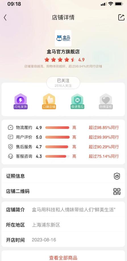 龙商网消息: 盒马官方旗舰店已入驻京东APP,该店首页显示,开店时间为2023年8月16日,已有2515用户关注,店铺为4.9星。目前,该店在售产品有休闲食品、果蔬鲜花、肉禽水产、乳品水饮、粮油干货、生活家居等。...