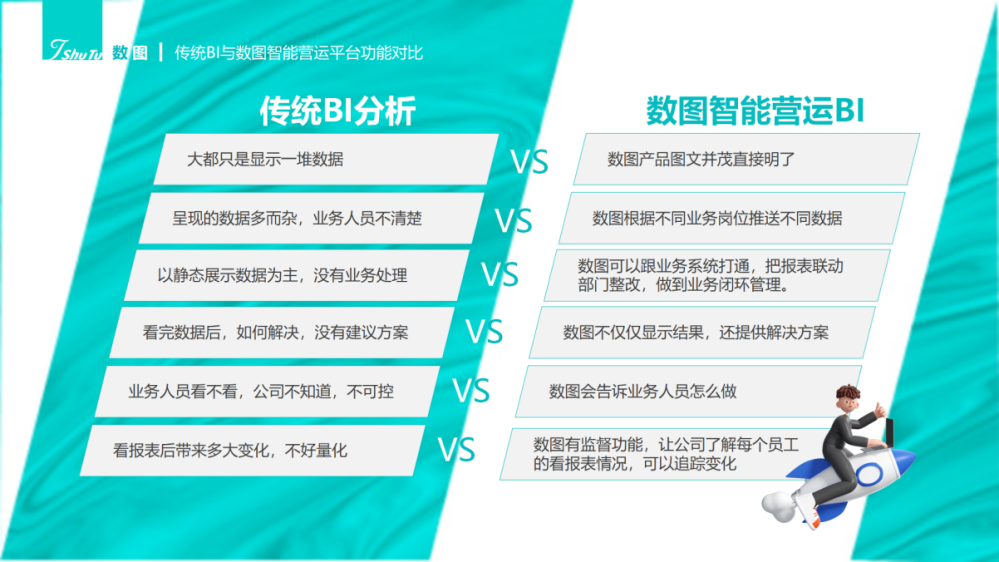 1)数图智能营运板块:有别于传统的BI,不仅仅是主动的展示数据,系统可以做到风险预警,决策建议,趋势分析;自动抓取问题点同时给出分析原因,并用文字版形式呈现总结以及战术建议,帮助企业管理好日常运营,把控好问题风险,调整好商品结构。