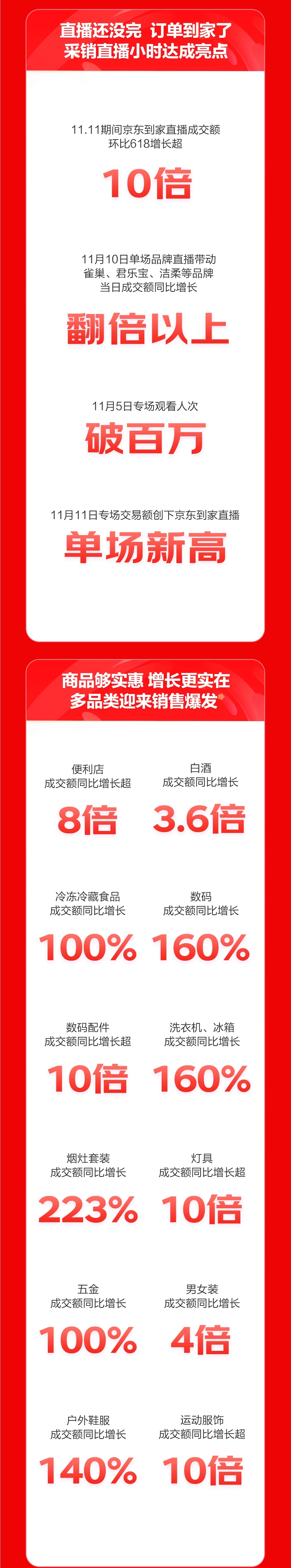 11月3日至10日,苏宁易购七位业务线总裁走进直播间,放送可叠加线下优惠的家电折扣券,共计带动线下家电销售增长135%。