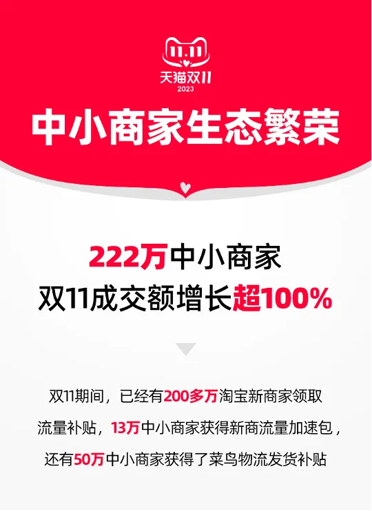 截至11月11日0点,天猫双11已有超过220万中小商家实现成交翻倍;