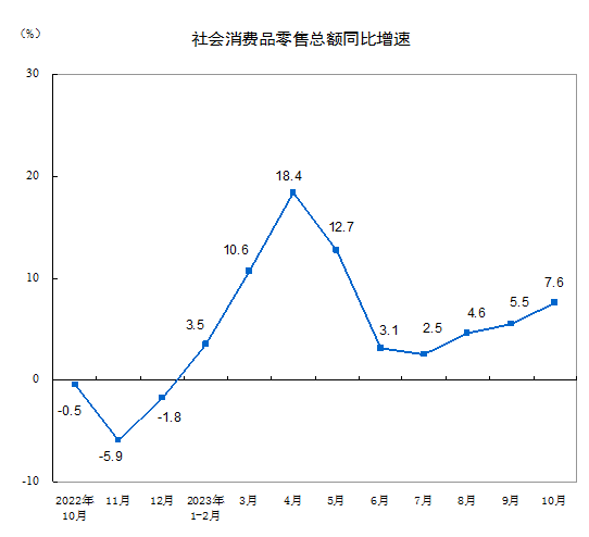 10月份,社会消费品零售总额43333亿元,同比增长7.6%。其中,除汽车以外的消费品零售额39198亿元,增长7.2%。