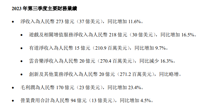 龙商网消息: 网易发布2023年三季度财报。财报显示,该季度营收273亿元,同比增长11.6%;非公认会计准则下,归属于公司股东的净利润78亿元,同比增长16.4%;游戏及相关增值服务净收入为218亿元,同比增加16.5%。报告期内,网易新闻客户端社区UGC内容同比增长...