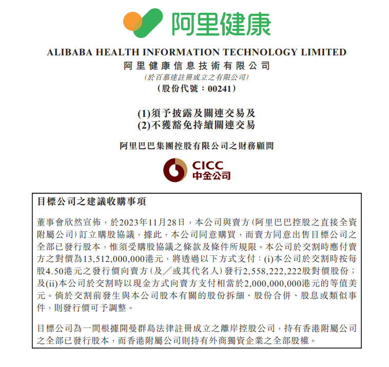 龙商网消息: 11月28日,阿里健康发布公告称,正式与阿里巴巴集团签署股权认购协议,以135.12亿港元对价,获得阿里妈妈医疗健康类目的独家营销审核权及附属权利。交易完成后,阿里巴巴集团在阿里健康的持股比例将从56.99%上升到63.83%。同日公告,公司执行董...