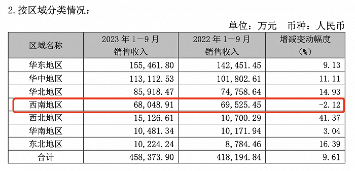 界面新闻查询养元饮品三季度财报,全国市场被分为华东、华中、华北、华南、东北、西南、西北7个大区,西南大区的经销商数量排名第四。报告期内,西南地区经销商增加了24个,减少了16个。全国经销商数量新增168个,减少107个,总数达2103个。