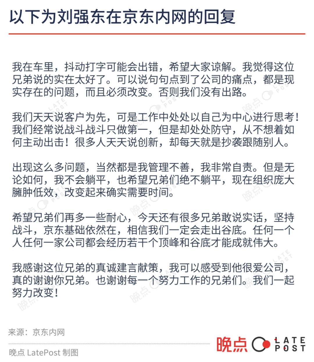 龙商网消息:12月10日,据《晚点 LatePost》,京东创始人、董事局主席刘强东日前在公司内网回复员工评论称,“无论如何,我都不会躺平,也希望兄弟们绝不躺平……京东基础依然在,相信我们一定会走出低谷。任何一个人任何一家公司都会经历若干个顶峰和低谷才能成就伟大。”据悉,刘强东此次发声是因为一位京东运营人员近日在内网发表了一篇长文,历数了在他看来京东目前存在的一些问题,主要包括:促销机制复杂;平台大促需要提前规划好节奏和力度;平台生态需要给到pop商家更多支持;低价心智,需要人人执行到位,贯彻到底。