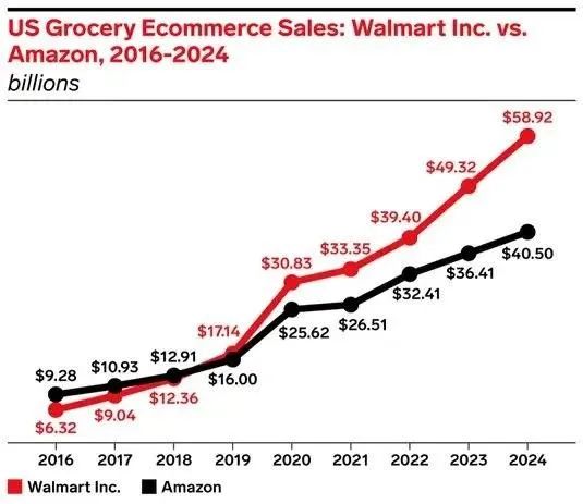 早在2016年,亚马逊就已控制了杂货电商市场24%的份额,而沃尔玛的份额仅为16.4%,但沃尔玛在2019年成功超越,此后一直保持领先。