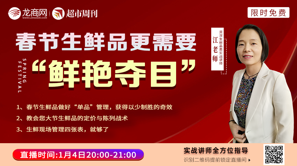 线上直播,限时免费 时间:2024年1月4日 20:00 主讲:资深生鲜实战讲师 主题:春节生鲜品更需要鲜艳夺目 内容: 1、春节生鲜品做好单品管理,以少制胜 2、大节生鲜品的定价与陈列战术 3、生鲜现场管理四张表,就够了 扫描预约,机会难得...