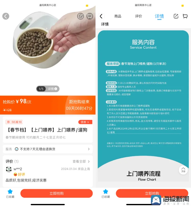龙商网消息: 盒马App的生活服务板块上新了春节档上门喂养/遛狗服务,原价128元,抢购价为98元。在详情页面中,盒马表示该服务仅限春节期间使用,可约日期为腊月二十七至正月初七,服务过程有专人对接、全程直播,主要内容为上门换水喂粮、遛狗陪玩等。对此...