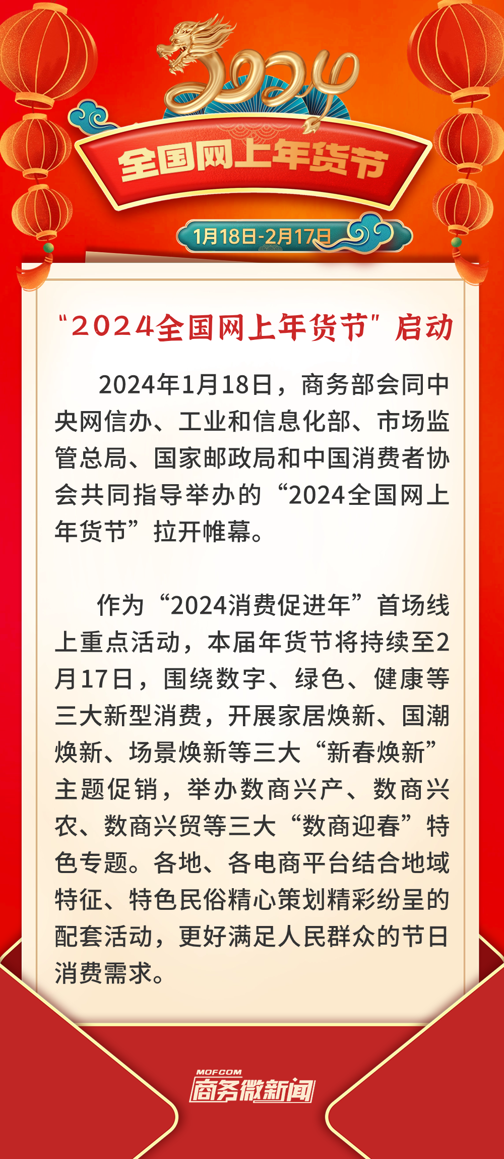 龙商网消息: 1月18日,商务部会同中央网信办、工业和信息化部、市场监管总局、国家邮政局和中国消费者协会共同指导举办的2024全国网上年货节拉开帷幕。作为2024消费促进年首场线上重点活动,本届年货节将持续至2月17日,围绕数字、绿色、健康等三大新型消费...