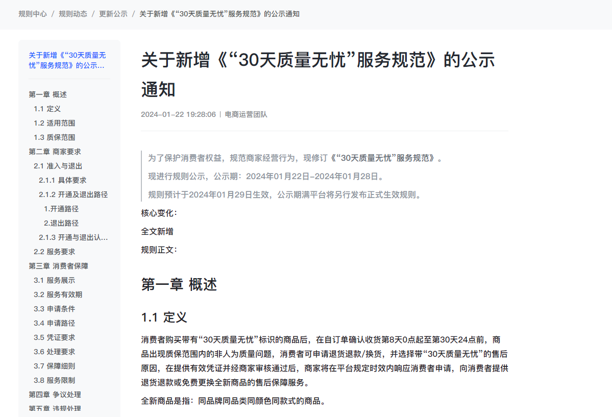 龙商网消息:抖音电商发布公示通知,新增“30天质量无忧”服务,主要针对女装、男装、童装/婴儿装/亲子装、运动服/休闲服装等一级类目的商家或商品。