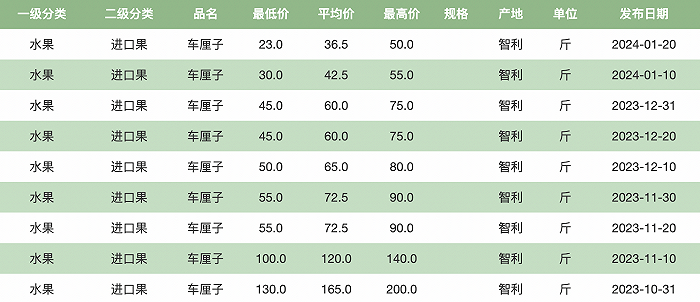 另据北京新发地批发市场的统计数据,2023年10月31日,车厘子的平均价格高达120元/斤,到了2024年1月20日,车厘子平均价格36.5元/斤,不到2个月降幅达到约70%。