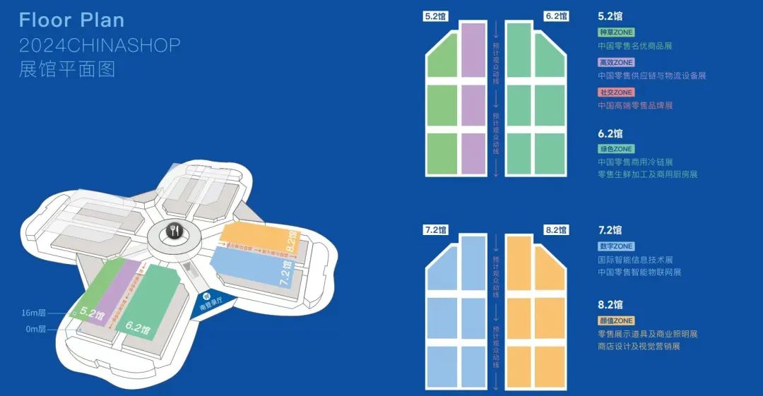 2024CHINASHOP将由6大主题ZONE——数字ZONE、绿色ZONE、社交ZONE、高效ZONE、颜值ZONE和种草ZONE;9大主题子展:中国零售智能物联网展、国际智能信息技术展、零售生鲜加工及商用厨房展、中国零售商用冷链展、中国高端零售品牌展、中国零售供应链与物流设备展、商品设计及视觉营销展、零售展示道具及商业照明展、中国名优商品展组成,覆盖零售全产业链。
