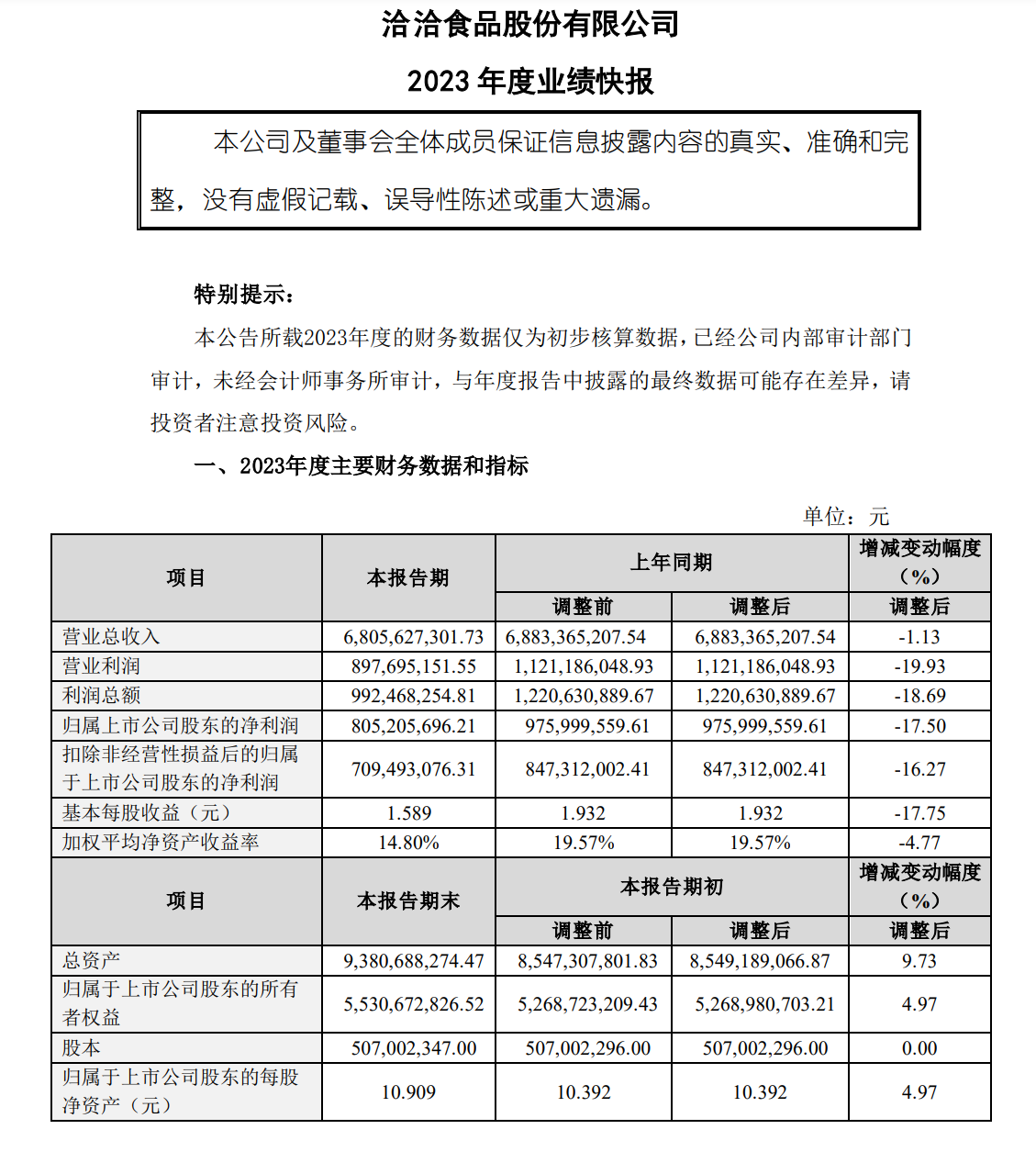 龙商网消息: 洽洽食品发布公告称,2023年实现营业总收入68.06亿元,同比下降1.13%;净利润8.05亿元,同比下降17.5%;基本每股收益1.59元。