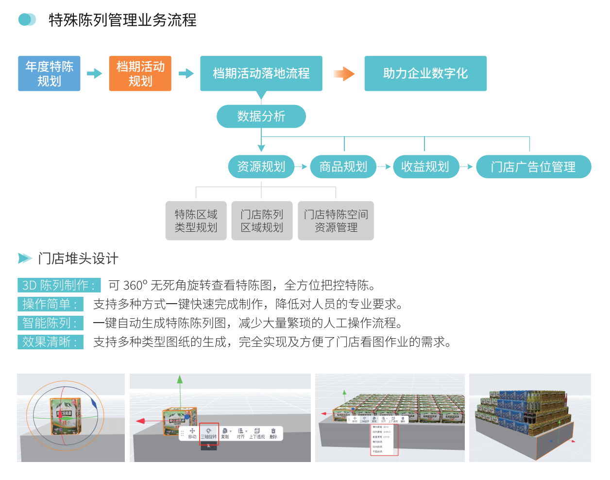 以品类管理为基础、从宏观布局规划到微观货架陈列、门店落位执行、数据分析,覆盖完整业务闭环,实现有限空间、陈列资源效率效益最大化。通过产品、陈列资源、供应商、广告位收益及投入成本等多维度的分析计算评估、把控特殊陈列的收益。将企业品类管理经验结合企业实际资源,转化为执行能力、管理能力,形成企业竞争力。