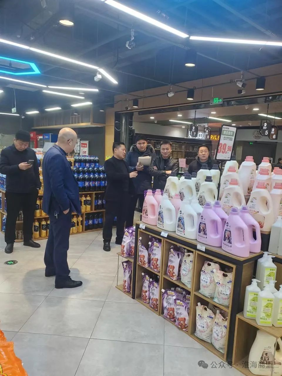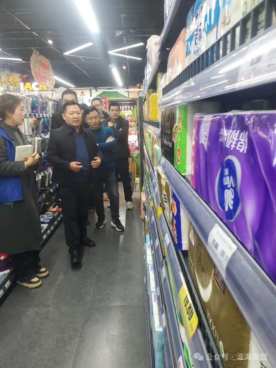 ▲3月16-17日,淮海商盟会长许治、副会长郑银良一行在扬州、盐城、宿迁等地零售市场调研。图为许治一行在沭阳慧百公司吉盛隆生活超市扎下店、新河店巡店指导,公司董事长康雷等陪同