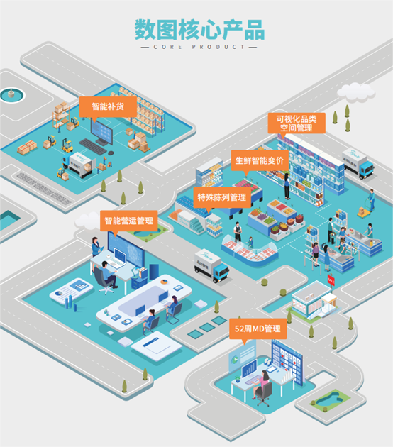 数图有独立研发的团队,研发了可视化品类空间管理(可视化陈列)、智能补货、智能营运、52周MD管理(促销活动规划管理)、生鲜智能变价以及特殊陈列管理等智慧零售解决方案产品。旨在为当下零售业解决数字化转型、精细化管理、绿色化经营等难题。